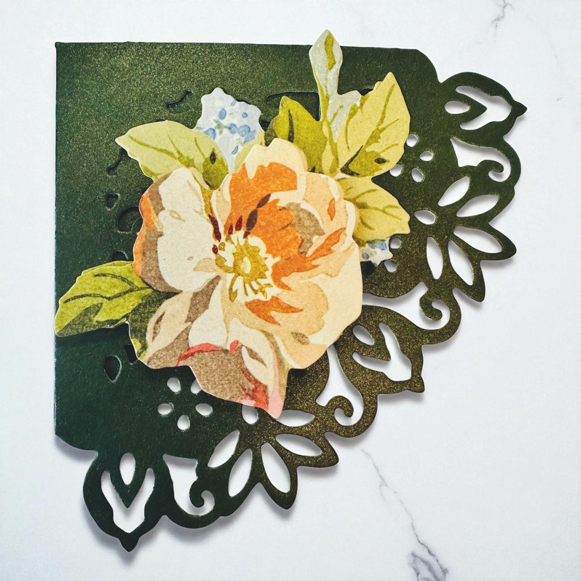Elegant bookmark with intricate cutout details and a layered flower embellishment.