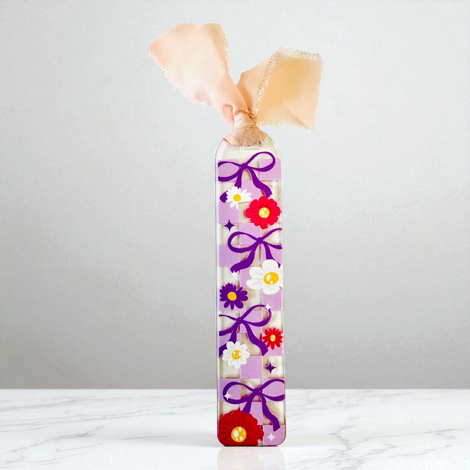 UV DTF acrylic bookmark with ribbon.
